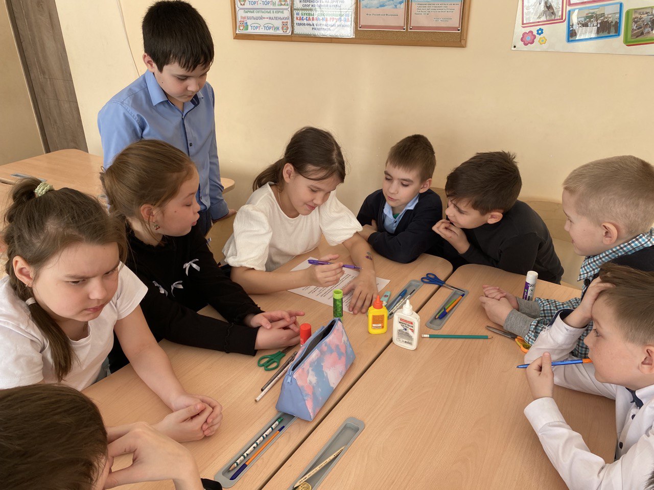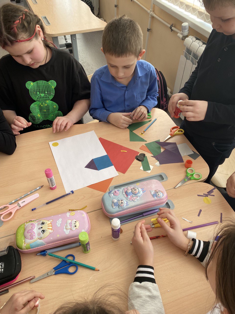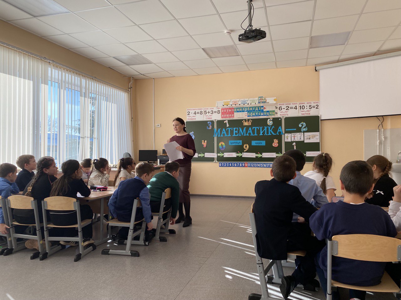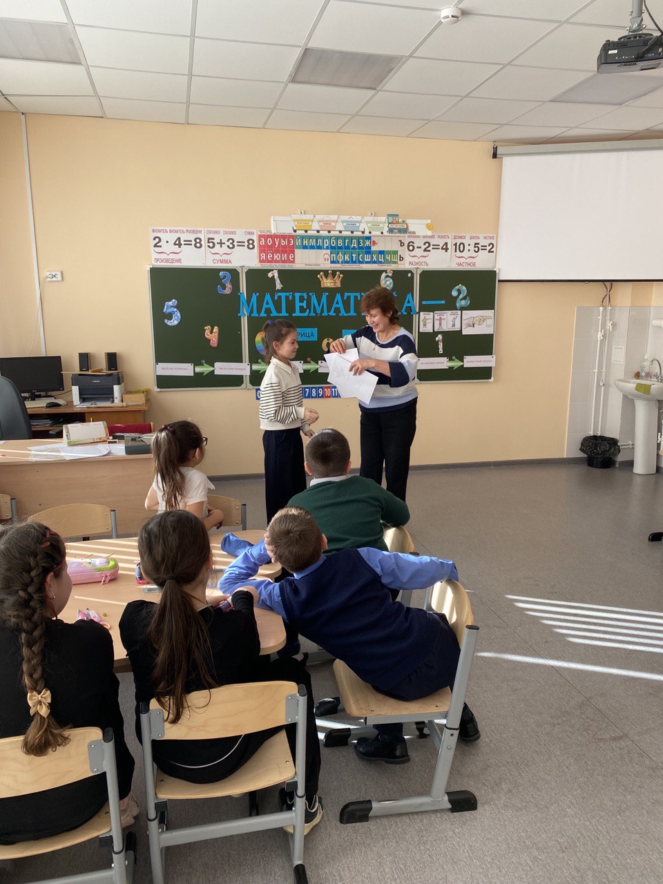 Сегодня в нашем классе прошла интеллектуальная игра «Математика вокруг нас». Ребята разделились на две команды и решали различные математические задачи: вспоминали пословицы с числами, находили старинные меры длины в литературных произведениях, делали аппликацию из геометрических фигур, помогали сказочным героям решить задачи, определяли неизвестный предмет по описанию. В ходе игры ребята проявили смекалку, находчивость, показали свои знания по различным темам.